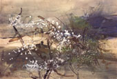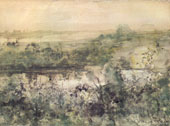 - Kleurreproductie op hoogwaardig Steinbachpapier waarop afbeelding aquarel 'Boomgaard in bloei, 1970'.