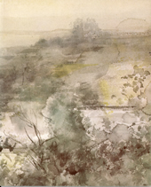 - Kleurreproductie op hoogwaardig Steinbachpapier waarop afbeelding aquarel 'Landschap met vijver'.